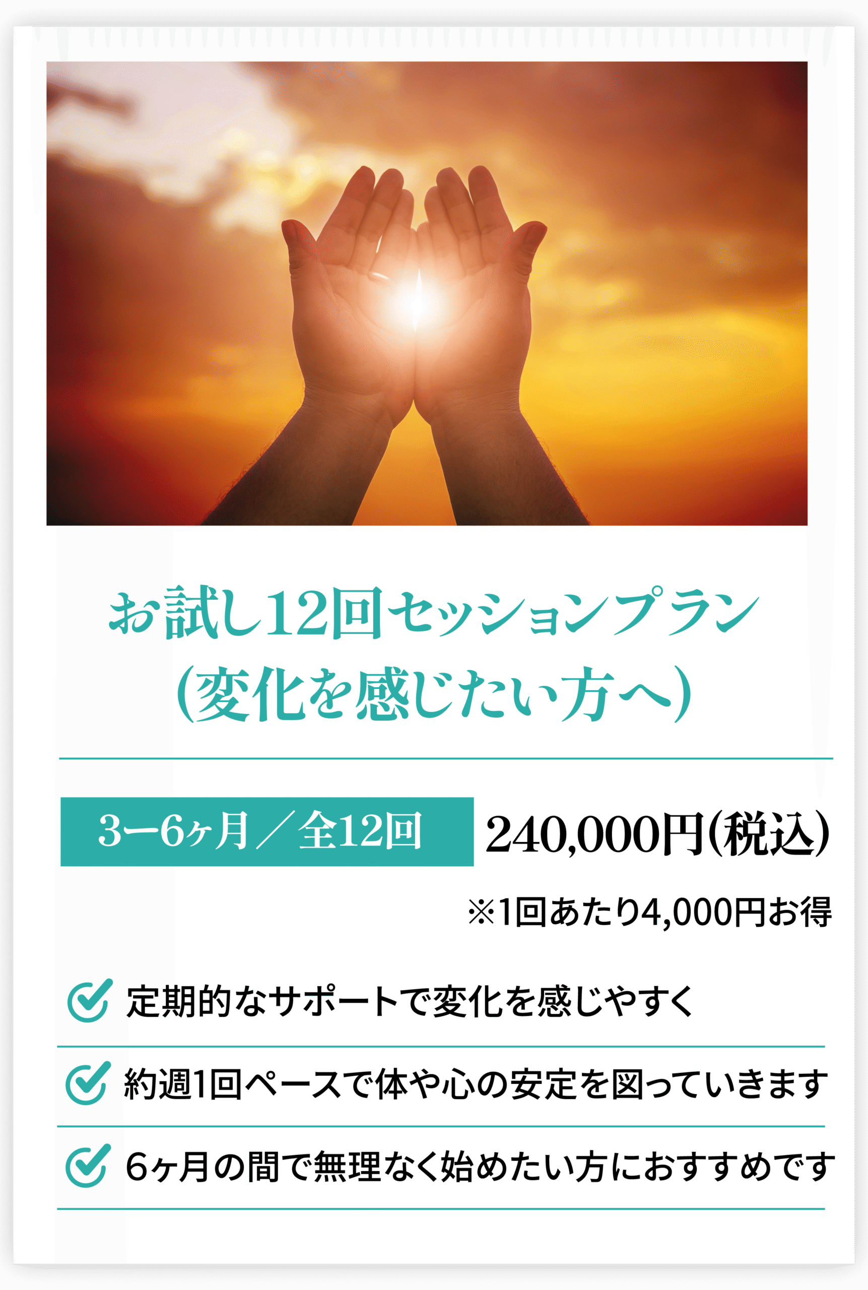 個人差はありますが、3〜5回を目安にちょっとづつ変化を感じる方が多いです。EFTは段階的に心身を整えるため、1回でも変化を感じる方もいますが、継続的に受けることでより深い継続的効果が期待できます。ペースや頻度は、お客様の状態に合わせてご提案させていただきます。お試し4回分をまとめたお得なセット料金(条件付き)もご用意しております。