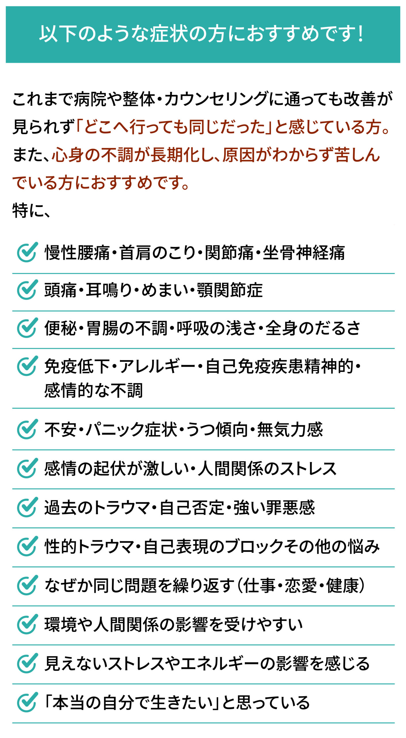 慢性的な不調などで医療機関に通っている場合も、補完的なケアとしてセッションを受けていただくことが可能です。事前にご相談ください。